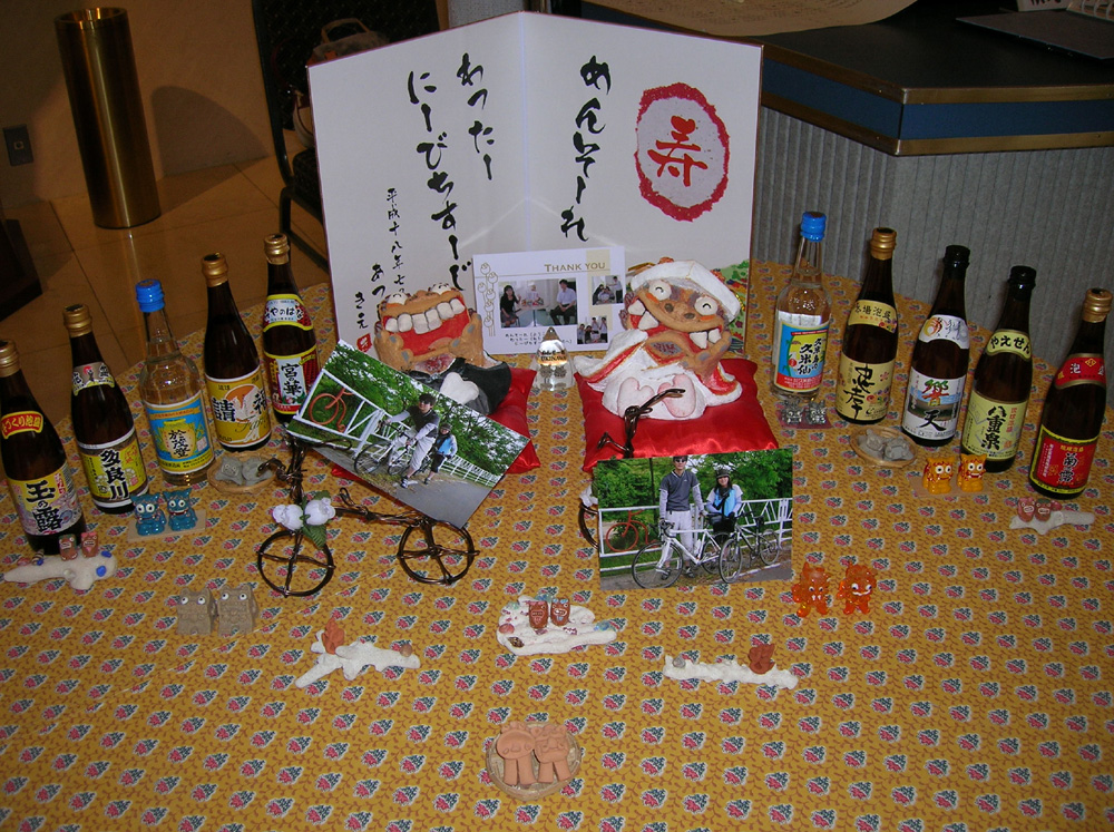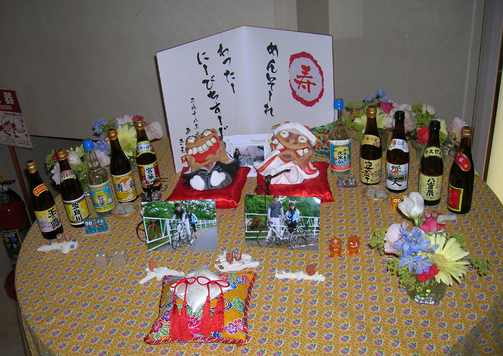 「ルピシア」というお茶専門店から毎月お茶が届くので、覚書程度の感想を書こっと。 今日のお茶。 5525 OASIS(オアシス)-グアバやパパイヤなどの熱帯の果実の甘い香りを、ローズヒップの酸味が引き立てます。アイスティーにぴったりのスッキリした飲み口。とのこと。 感想:ローズヒップが苦手なので、恐る恐る・・・。でも、程よいブレンドなので、普通に飲めた。ホント、すっきり。ホットで飲んだけど(^_^;) 8500 HONEY&PEAR(はちみつ和梨)-みずみずしい日本の梨と甘いはちみつのハーモニー。フルーティーですっきりした中に、自然のままのほんのりした甘みが広がります。とのこと。 感想:これは、うまい。しかも、梨が食べれる!甘くておいすぃ~☆ウーロン茶っぽい。 PR 新婦は、大の沖縄好き!ってことで、こんな感じにしてみました。自転車に写真を挟めていたんだけど、どうも、ずれちゃうみたいで、仕舞いには下に置かれて、自転車が見えない・・・(-_-;) しかも、下の派手な布地のせいで、ミニシーサー君たちがいまいち・・・。 ま、しょうがないのですが・・・。 ちなみにこのウェルカムシーサー、屏風、リングピローは「Bless you」さんから購入しました!!ホント素敵っす☆